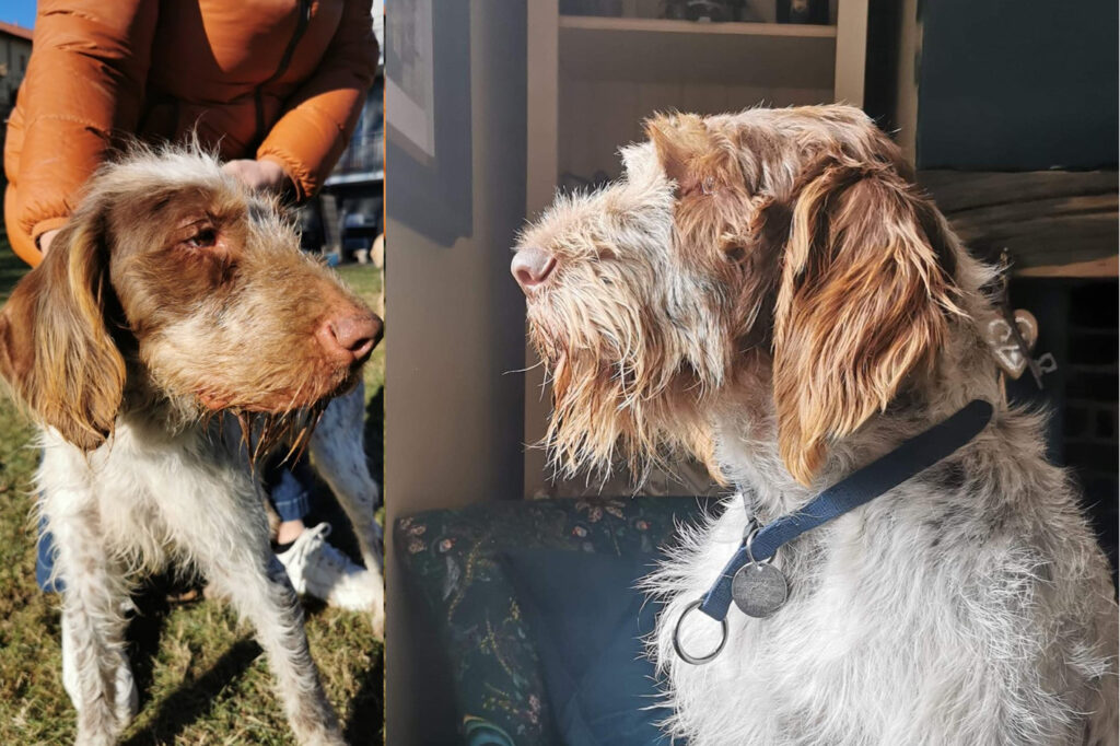 Bailey, thin and scared in the shelter in Italy – proud and magnificent in his new life in the UK